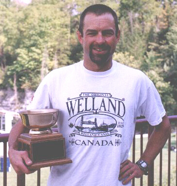 - Left: David Cassels (40) proudly displays the Manulife Trophy for the fastest man. His 1999 swim marks his fifth successive winning of the trophy. In
