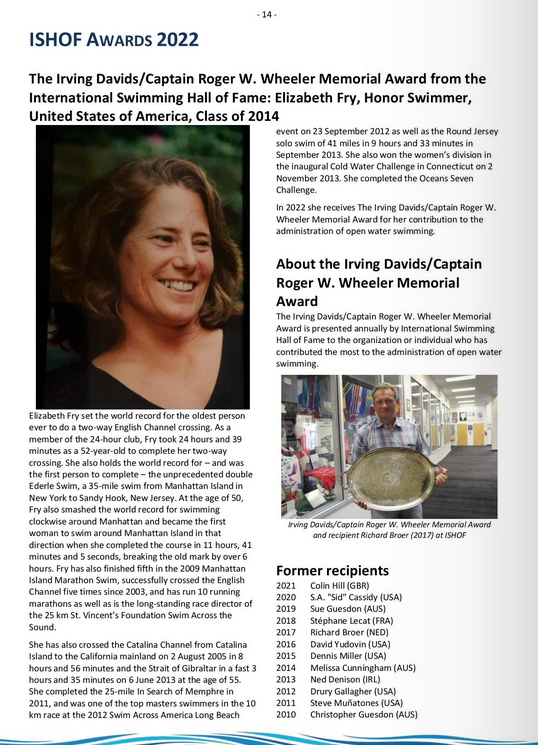 Liz is an internationally-accomplished marathon swimmer who was inducted as an Honor Swimmer into the IMSHOF in 2014.