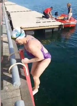 After touching the wall to finish, the photo shows Elizabeth exiting the water by climbing a ladder (Without problem) at
