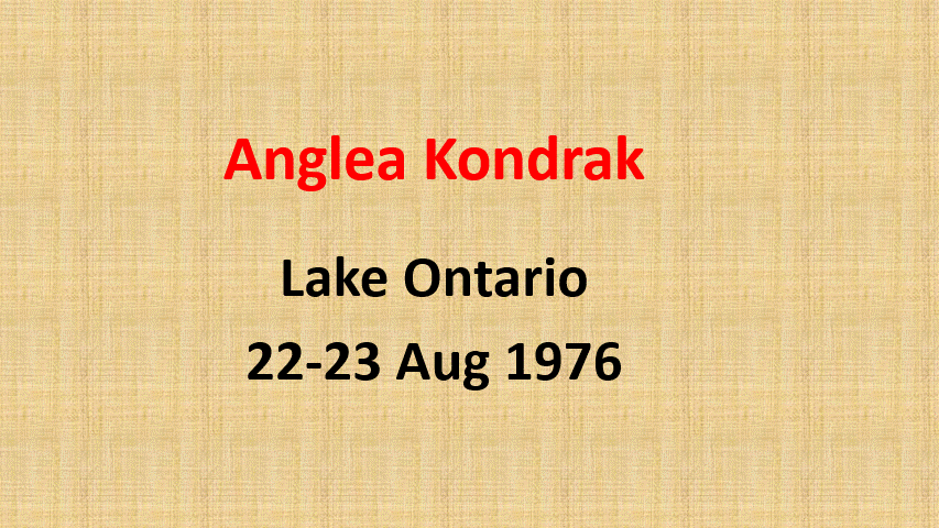 Her swim started on 22 August 1976. She completed the swim, the following day (Her 17th Birthday), with a time of 23 hours 48 minutes. Angela's success, with coach Art Dufresne, came after two previous attempts to cross the lake in 1974 and 1975. Her first attempt, at age 14, was after she had successfully competed in the 1974 La Tuque, 24-hour, relay swim. |