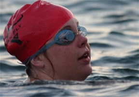 Jenna's morale-boosting pacers during the swim were her thirteen-year-old sister Natalie (See top-left above with Jenna), an accomplished swimmer herself, and her Coach, Vicki Keith.