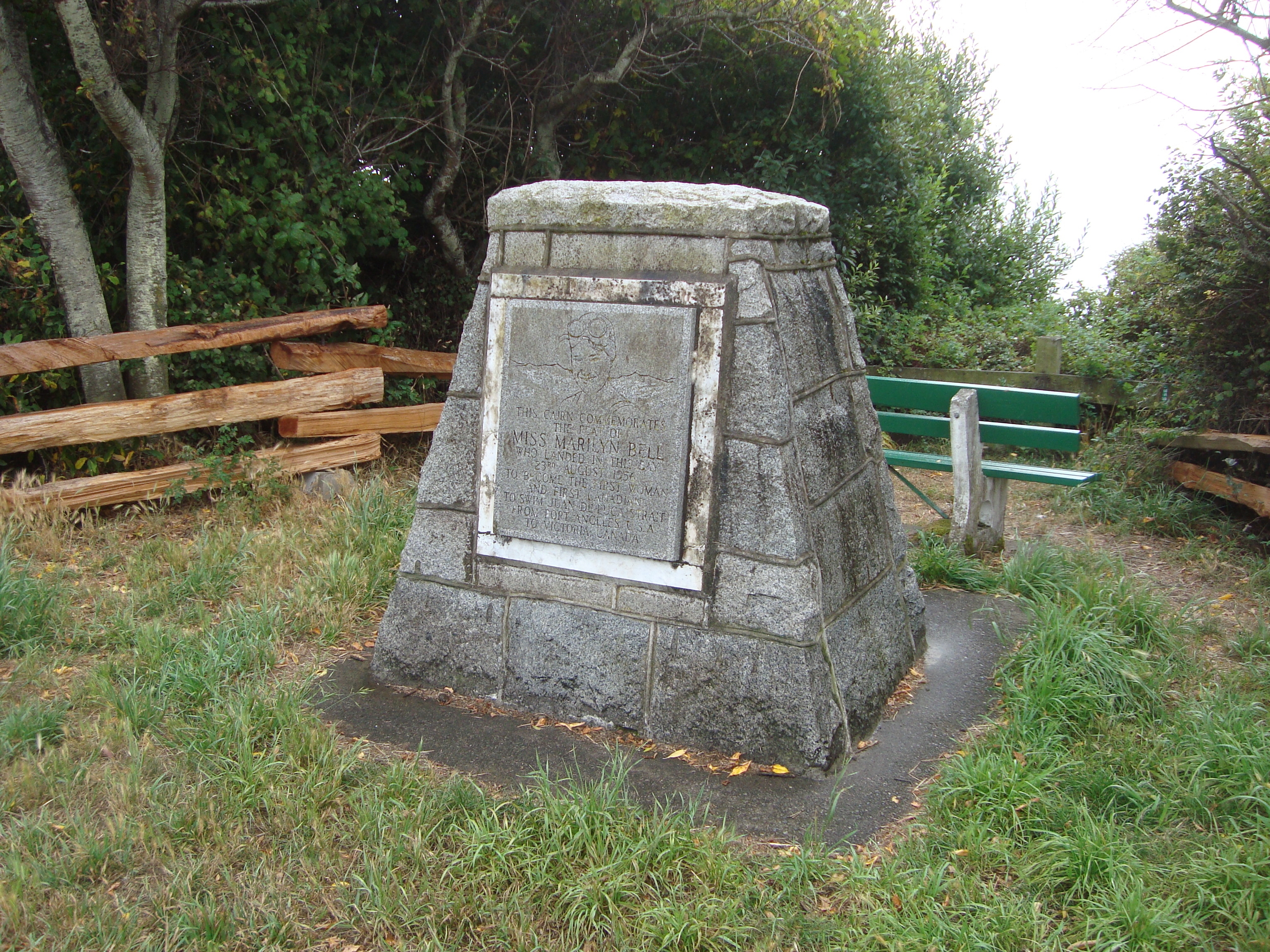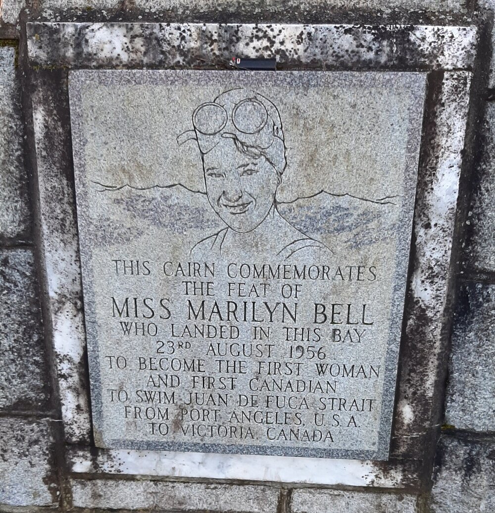In recognition of Marilyn Bell's 1956 crossing of the Straits of Juan da Fuca, a commemorative plaque was placed in Beacon Hill Park in Victoria, British Columbia,.