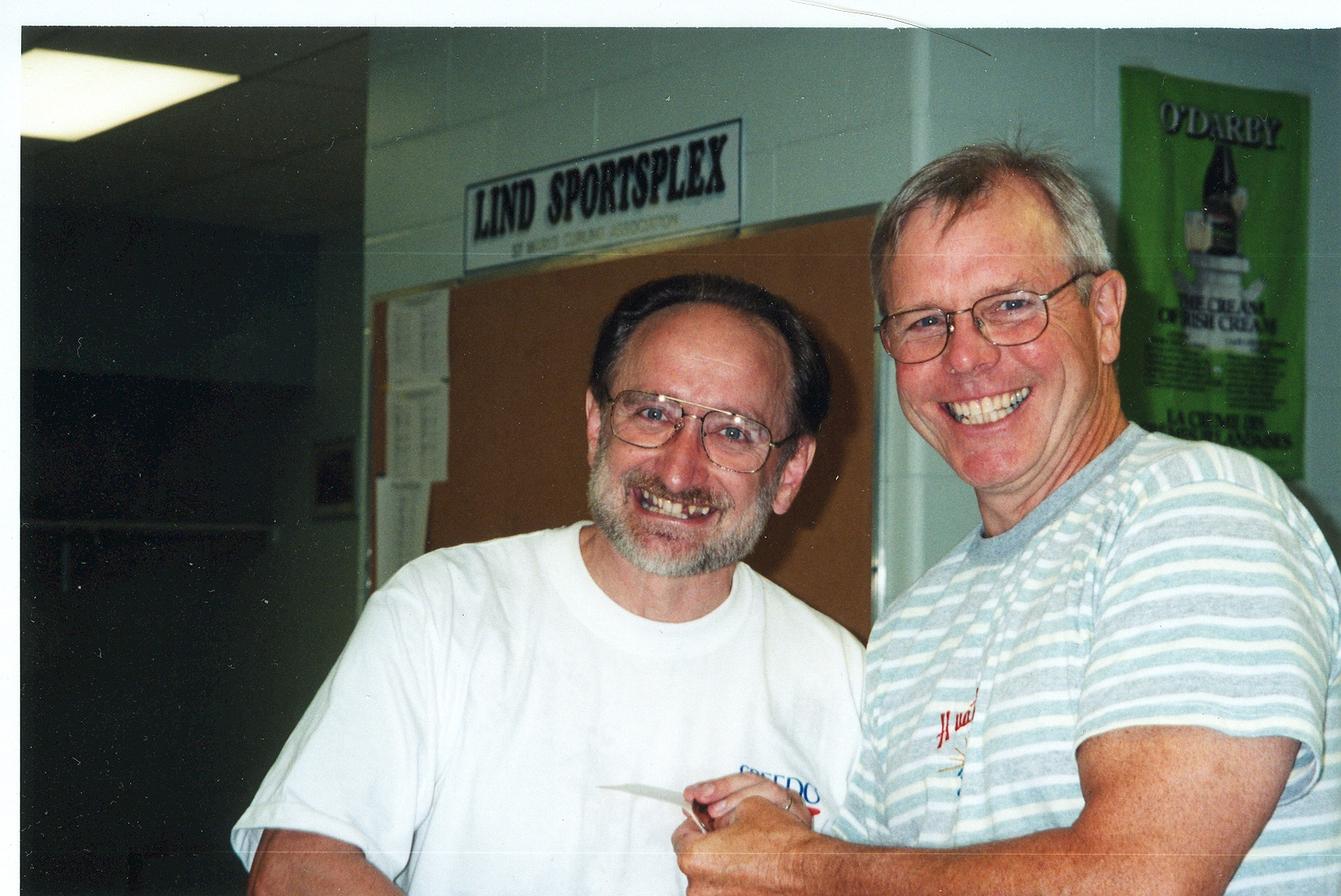 * At age 47, he is seen in left photograph, with Bryan Finlay at the end of a 5 km St Marys race in 1998.