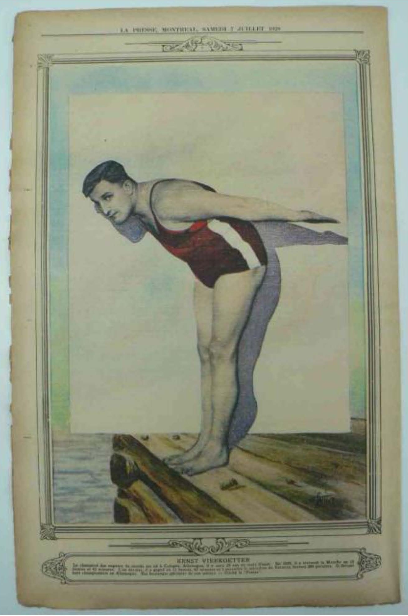 Due to the black grease that he used during his swims, Ernst was dubbed the "Black Shark" and was reportedly the idol of the crowd after his CNE win. On the left, Ernst is shown in a July 7, 1928 image in the Montreal, La Presse. |