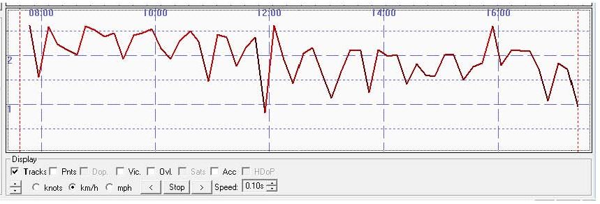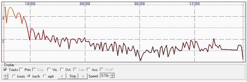 ![]() The Speed Data were computed from the GPS positional data that were transmitted every 10 minutes from the SPOT Tracker that was in the boat beside Brenda. The speed ranges between 0.9 and 2.6 km/h with the ``dips`` being reflective of stops that occurred during the associated 10-minute period. Note: the targeted finish had been the public beach at Crystal Beach, which is to the west of the final landing point; however, a sailing regatta forced a change