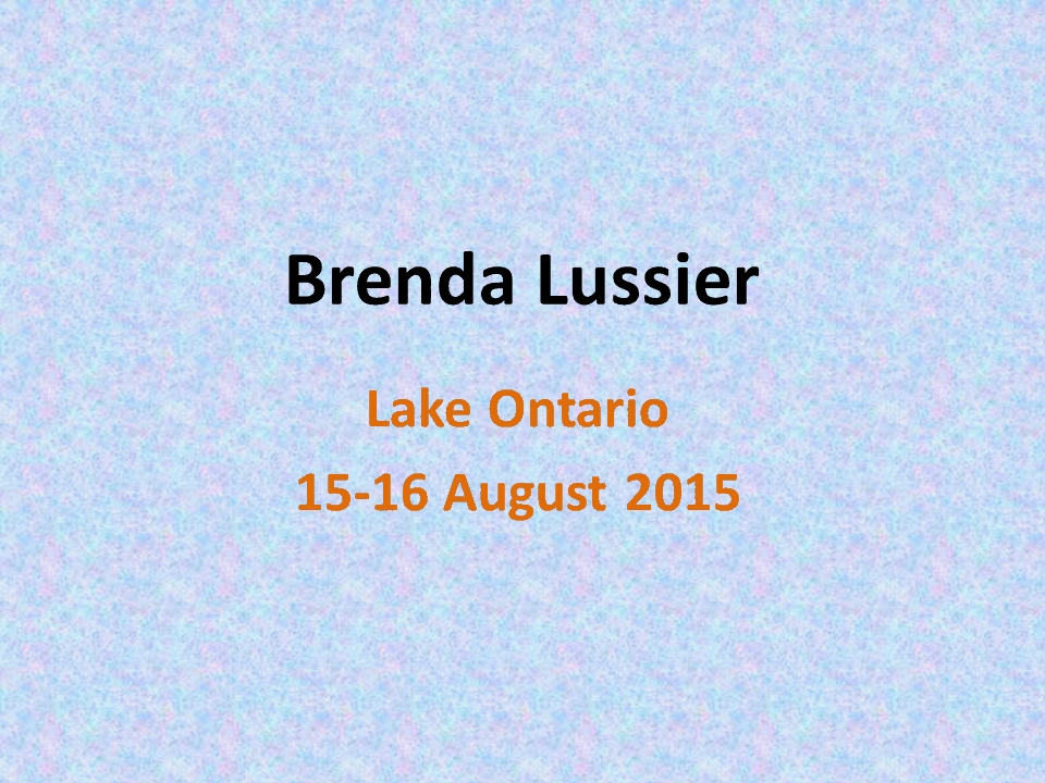 18 July 2015 7:20 am 10 hours 3 minutes Sturgeon Point, New York state. Beach on the west side of the marina, 42.691827°N, 79.047483°W Crystal Beach, Ontario. Municipal boat launch, 42.858573 °N, 79.057865°W 18.6 km (11.5 miles) "D" designates a Deaf support-person Colleen Shields Joey Bell (D) Kathleen Rosalie Vissers Gord Histrop Pocomar, Norm Dashwood, Dawn Currie, Lucas Mark, Jeff MacDonald Joey Bell (D) Joey Bell, Rebekah Boscariol Megan Lussier (D) 20°C (68°F) until the last 3 km where it rose to 21.7°C (71°F) 52 strokes per minute until the last 3 km where it dropped to 48-50 SPM SW-WSW winds for the first 1.5-2 hours creating waves of 0.5-0.9 m (Up to 3 feet), then relatively calm for the remainder of the swim with the winds freshening again after the swim was completed A fog rolled in after the first two hours of swimming and did not disperse until Brenda was about 3 km away from Crystal Beach . |
