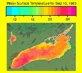 A typical example of such data is shown in the figure and the colour-coding in the original data permits temperature-specification to an accuracy of 1°C. In this example, Lake Ontario is clearly visible, together with the combination of Lakes Simcoe and Couchiching.