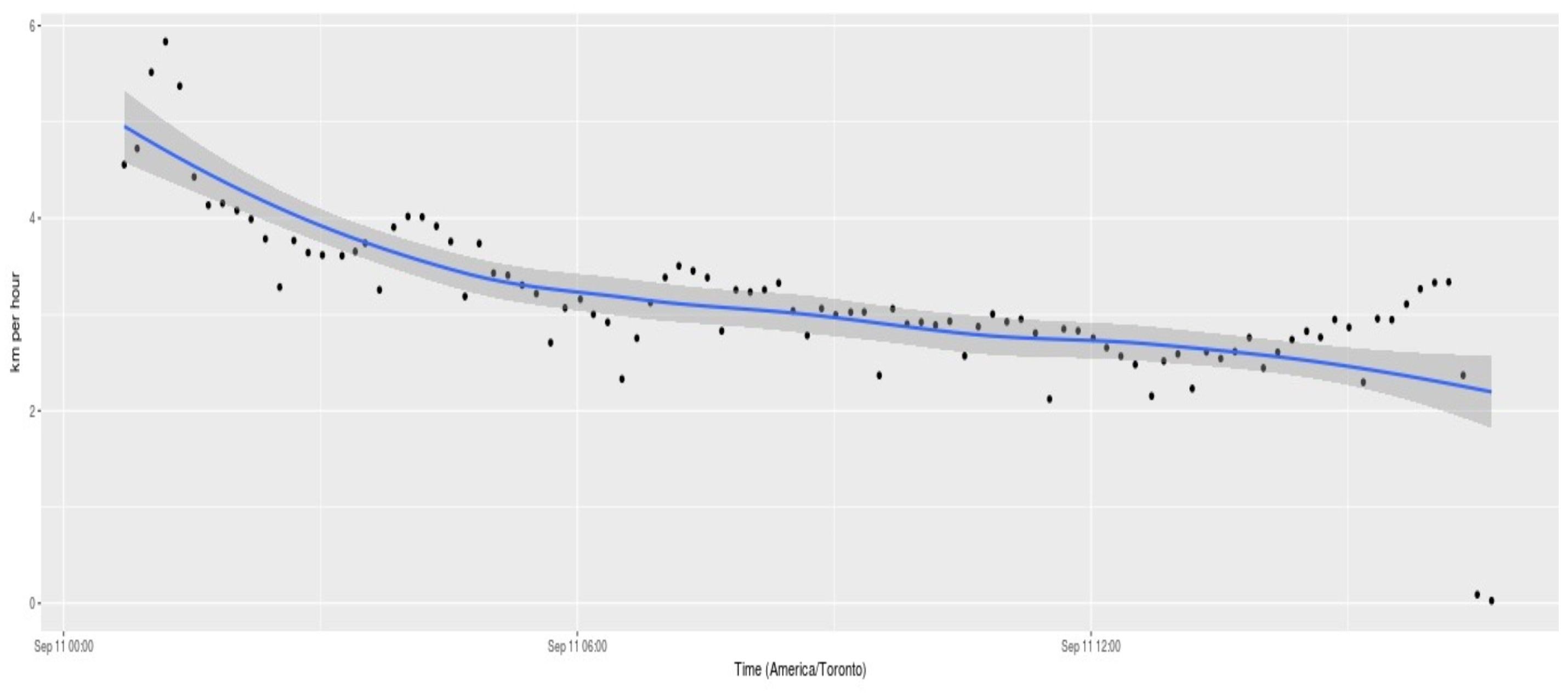 two weeks that the crew and vessels came together. Both Liz and her crew were in attendance at SSO's 2018 annual Awards Ceremony that was held in Niagara-on-the-Lake. A number of photos from that session, which was also attended by Marilyn Bell, are included in the animated gif. The plot of speed has a few jumps in speed since the Tracker was located in one of the boats that accompanied Liz and so reflects movements of the Tracker which, consequently, only provides a rough indication of the swimmer's speed, especially where highs and lows appear. |