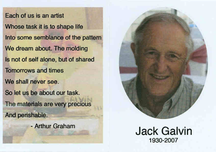 Retired, Jack Galvin, Design Artist, founding president of North York Masters Aquatic Club, past-president of Gwendolyn Park Tennis Club, painter, sculptor, Kiwi extraordinaire! Peacefully, surrounded by his loving family and with his beautiful wife at his side, on Friday, August 31st, 2007 at Sunnybrook Health Sciences Centre, Toronto, in his 77th year. Beloved husband of Lyla for over 53 years. Loving and very devoted father/father-in-law to Douglas (Judie), Russell (Rebecca Poon) and Tracy (David Hynes). Cherished and adoring 'Poppa' of Kristy, Kim, Sadie and Frances. Dear brother to Dennis of New Zealand, Brian of Australia and Pattie (Fred McMillan) of New Zealand. Lovingly remembered by his niece Vicki Meyer of New Zealand, as well as by many other extended family and so very many dear friends. Jack was born in Wellington, New Zealand and raised in nearby Wanganui where he developed his love of swimming and all sports. Losing his mother at a young age, Jack learned to be self-sufficient and began his lifelong skill of self-education. Leaving NZ in 1952, Jack met his bride-to-be, Lyla, onboard ship enroute to travel Europe. Married in London, England in 1953, they stopped in Canada on the way back to NZ and stayed for good. After leading the design effort for the 'Indians of Canada' pavilion at Expo 67, Jack successfully ran his own design business for many years. In 1969 Jack designed and built his family home in an idyllic valley of the west Don River. Jack's love of life was expressed in his vibrant paintings, woodcarvings, furniture, and other creations, as well as in his penchant for costume parties, singsongs around the piano or campfire, card nights, doing the haka, and midnight tobogganing. Musically gifted, he could play most instruments he picked up. His enthusiasm, hospitality and good humour were legendary among his many friends and he was always the first to volunteer, whether for a new adventure or to lend a helping hand. Jack was a lifelong good steward of the earth and a regular blood donor. After retirement, Jack and Lyla did not slow down. They traveled, continued tennis and competitive swimming, and swam regular mornings at the Frost pool. Jack took up downhill skiing at age 65 and spent many wonderful days flying down the slopes - finally getting a helmet at 74! Jack never lost the spark of youth or the twinkle in his eye. He lovingly cared for his beloved Lyla until his last day. Those who knew him, will remember him always.