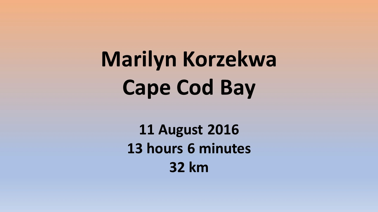 Marilyn completed the 32 km crossing of Cape Cod Bay (Plymouth to Provincetown, MA) on 11 August 2016 a