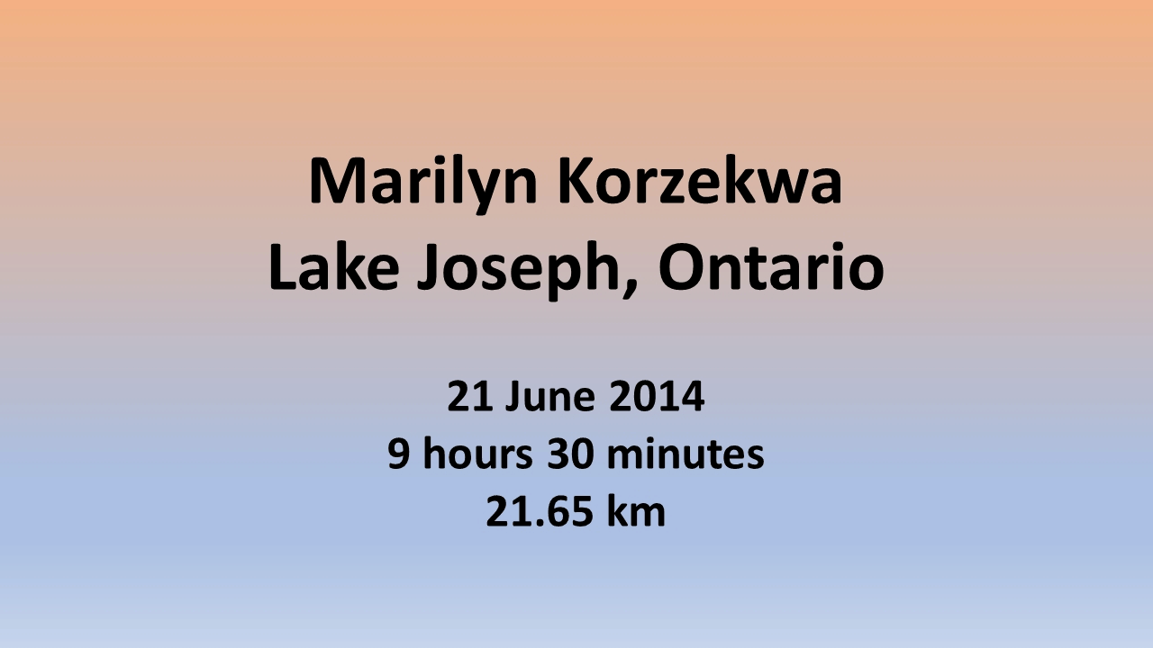 Lake Joseph 2014At age 57 years and 75 days, Marilyn completed the first recorded distance-swim on Lake Joseph with a time of 9 hours 30 minutes on a course of 21.65 km. The swim started at Cetennial Beach, 276 Clear Lake Road, Port Cockburn (45.253766 N, 79.7657833 W) and headed south to finish at a beach east of the dock at Port Sandfield (45.1155833 N, 79.62115 W). This swim was a training event for her Manhattan Island swim which she completed in the following month. Her two-person crew included fellow swimmer Thie Convery. A news report was issued on MuskokaRegion.com. |