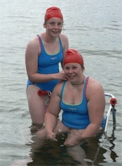 Jenna's morale-boosting pacers during the swim were her thirteen-year-old sister Natalie (See top-left above with Jenna), an accomplished swimmer herself, and her Coach, Vicki Keith.