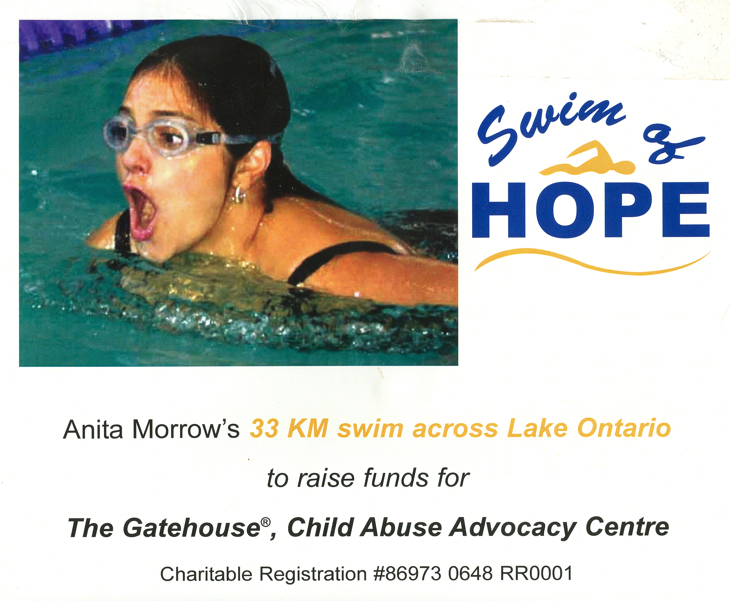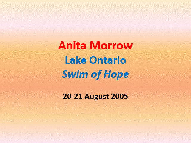 Anita Morrow's BREASTSTROKE swim to cross Lake Ontario in 2005 involved a massive effort of more than 14 hours against the worst of the Lake's currents and, as such, is certainly one of those noteworthy swims; however, her associated fund-raising efforts for "The Gatehouse, Child Abuse Advocacy Centre" are a true reflection of her Heart, along with her ongoing concerns and drive for the well-being of everyone. Anita's story has four main aspects to it: |