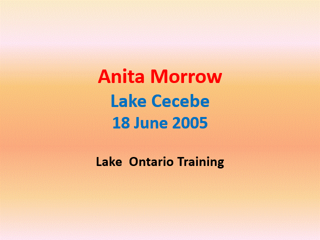 Lake Cecebe Training Swims, 4 & 18 June 2005Anita swam for many hours in indoor pools in preparation for the open-water season, and on June 4, 2005 completed a 7-hour, 10 km swim on Lake Cecebe where she and her husband owned a cottage . Lake Cecebe is located to the east of Georgian Bay of the Canadian Great lakes. Her first serious preparatory open-water swim with her assigned Swim Master, Bryan Finlay, took place at the same location and over the same course on Lake Cecebe on 18th June 2005. This swim was conducted as her official SSO 6-hour Trial Swim. Her 10.1 km course is illustrated in the adjacent image and, starting at 11:35 am, she completed the distance in 6 hours 4 minutes. CREW: Scott Morrow, Arthur Henes, Shelley Reid, Bryan Finlay (Swim Master), and Matisse (Anita and Scott's