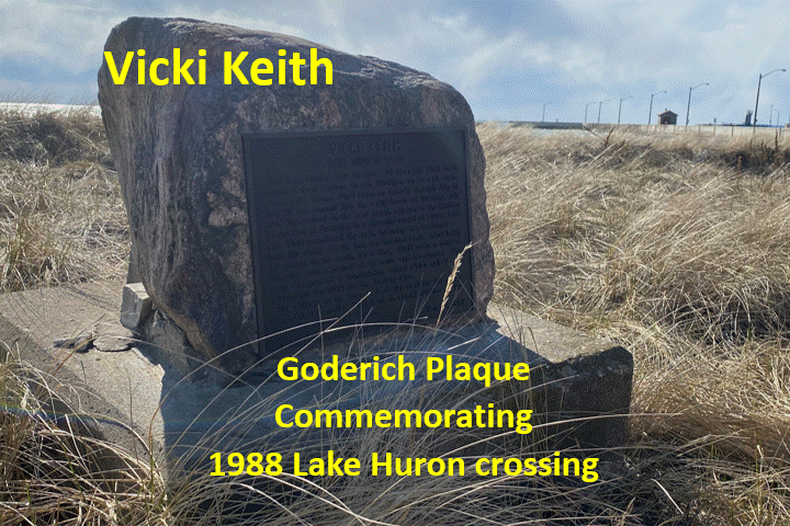 VICKI KEITH LAKE HURON SWIM At 7 a.m., Sunday, July 17, 1988, 27 year old Vicki Keith departed from Harbor Beach on an epic swim across Lake Huron. Vicki swam on bravely through July 17, July 18 and onward into the early hours of Tuesday, July 19th. She arrived on the sand beach adjacent to the harbour at the Port of Goderich to a cheering crowd of 400 at 5:55 a.m. Vicki completed the swim by using her trademark butterfly stroke for the last few hundred yards. After being off course to the south, for a time, Vicki swam a total of 48 miles over a period of 46 hours and 55 minutes. The swim was part of a fundraising effort which raised $548,000 by Vicki for the Variety Club. The citizens of the Town of Goderich dedicate this plaque Nov. 29, 1989 |