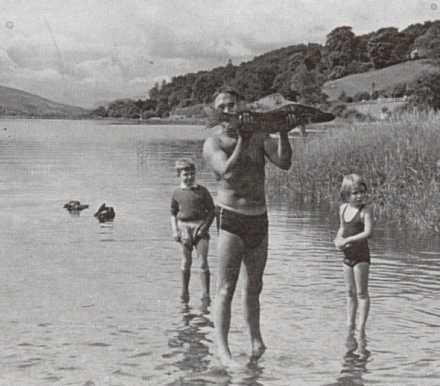 In the right photograph, in the early 1960s, John is seen at Lake Bala (North Wales) displaying a pike. He's probably telling the children-onlookers that he just tired-out the pike in a race during a training swim!