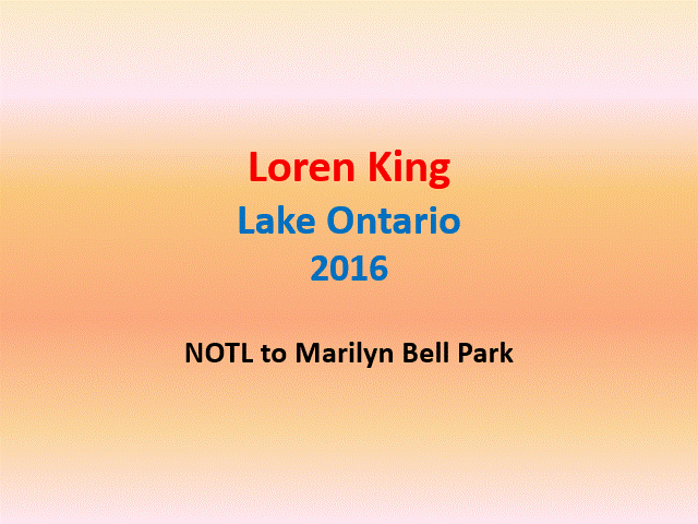 At age 48, on August 1-2, 2016, Loren King crossed Lake Ontario from Niagara-on-the-Lake to Marilyn Bell Park (MBP) in a time of 18:35:08.